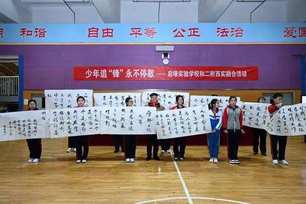 3月5日,在第61个学雷锋纪念日来临之际,解放军原南京政治学院政委文忠民将军应邀来到北京启喑实验学校参加了“少年追 ‘锋’,永不停歇--启喑实验学校与北师大二附中西城实验学校‘学雷锋’融合活动”,并亲手向该校赠送了他书写的《雷锋日记·九篇》10米长卷书法作品,还为在校师生题字:“让雷锋精神在校园扎根开花结果”。