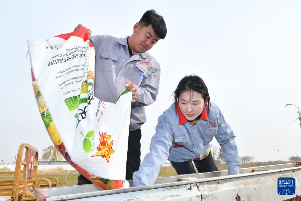 3月7日,张宸(右)给安装了北斗导航辅助驾驶设备的农机添加肥料。